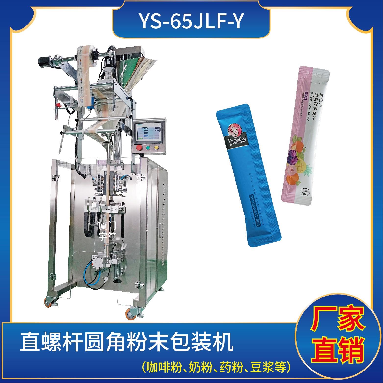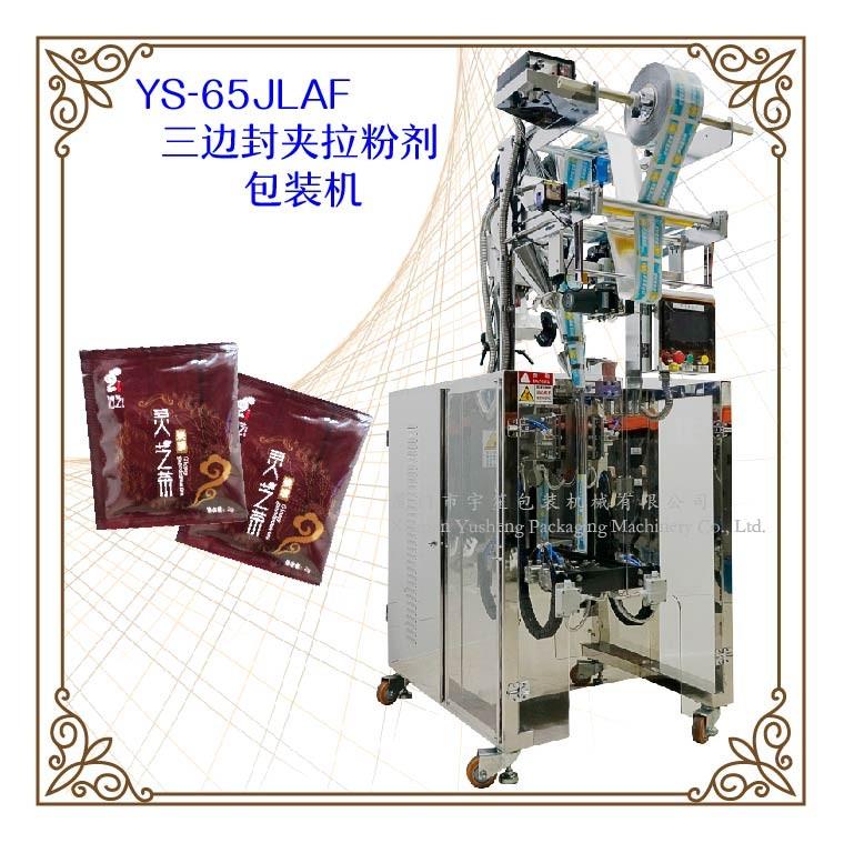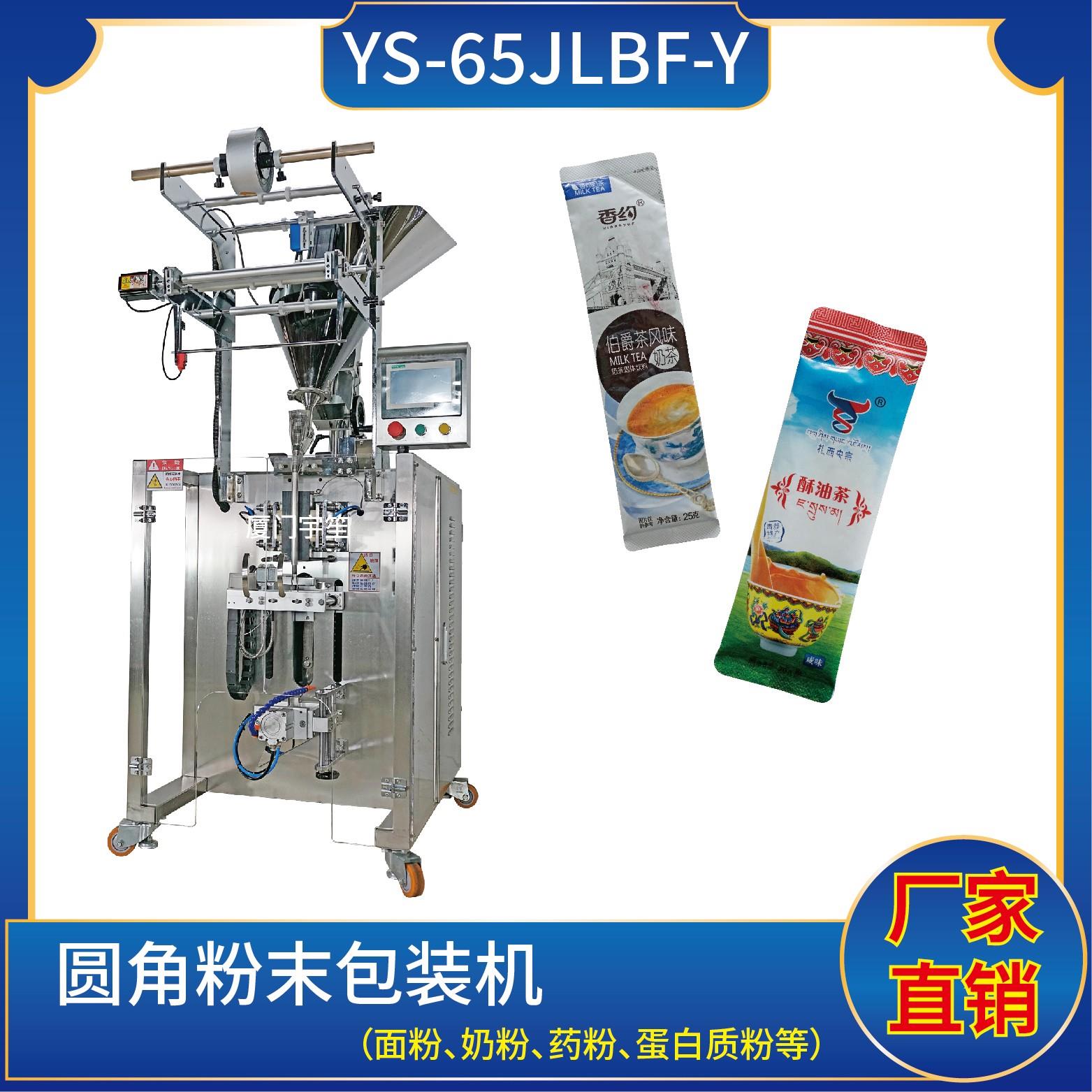 YS-65JLBF-Y 夾拉圓角粉劑包裝機特 點 1、適用于食品、醫藥、化工、化妝品行業中粉劑等物品的計量包裝。.2、可自動完成制袋、計量、下料、封合、分切、計數、且可根據客戶要求配置打印批號等功能。3、觸摸屏操作,PLC 控制,伺服電機控制袋長,性能穩定、調整方便、檢測準確。智能式溫控儀,PID調節,保證將溫度的誤差范…