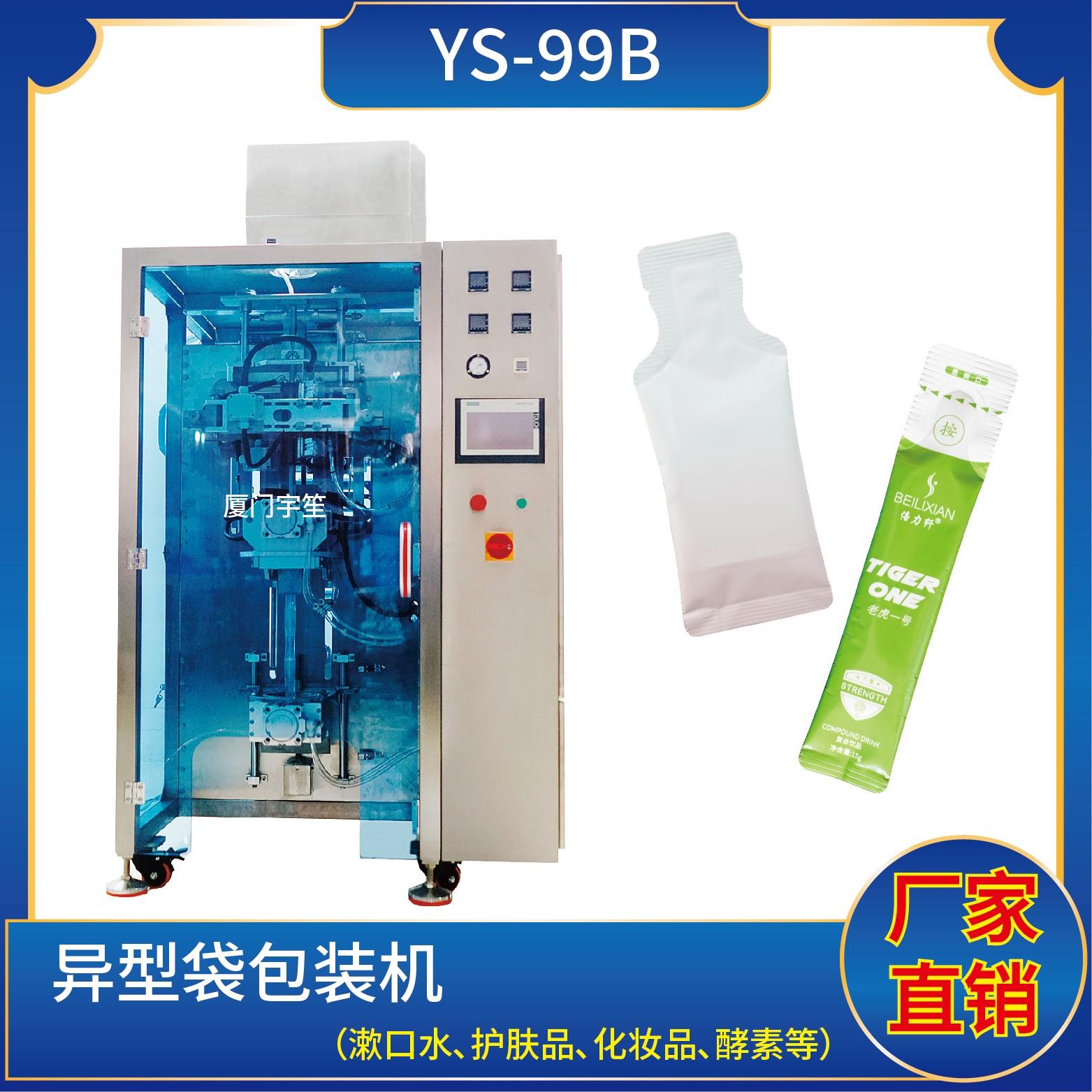 YS-99B 異形袋包裝機特 點1、適用于食品、醫藥、化工、化妝品行業中液體、醬料等物品的異形袋計量包裝。2、可自動完成制袋、計量、下料、封合、分切、計數、且可根據客戶要求配置打印批號等功能。3、觸摸屏操作,PLC 控制,伺服電機控制袋長,性能穩定、調整方便、檢測準確。智能式溫控儀,PID調節,保證將溫度的誤差范圍…