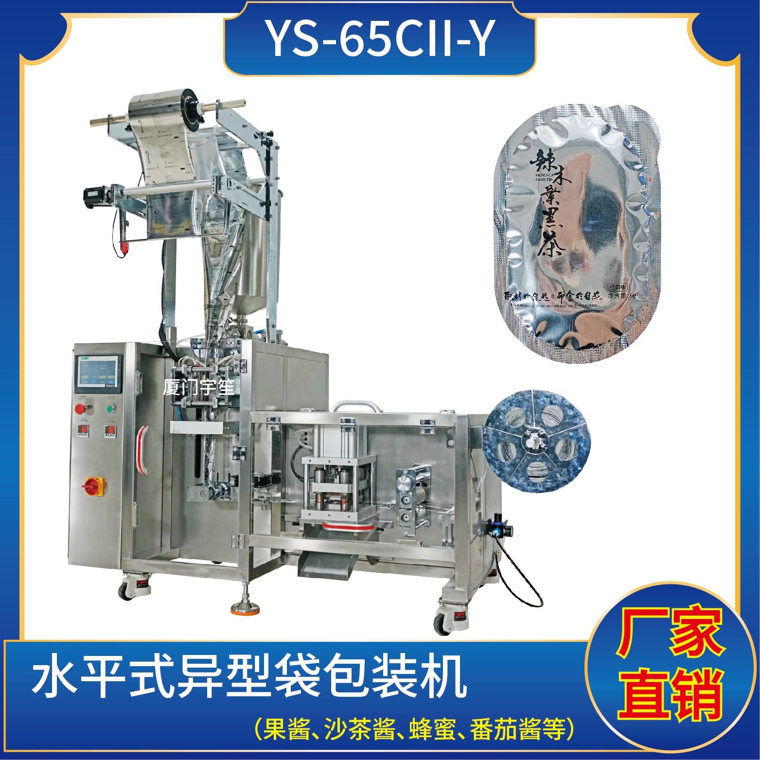 YS-65CII-Y 水平式異型袋包裝機 (使用鍍鋁、塑膠膜包裝)特點:1、適用于食品行業顆粒、粉劑、液體、醬料等物料的計量包裝。2、可自動完成制袋、計量、下料、封合、分切、計數,可根據客戶要求配置打印批號等功能。3、采用觸摸屏操作PLC控制,驅動步進電機控制袋長,性能穩定、調整方便、檢測準確。智能式溫控儀,PID調…