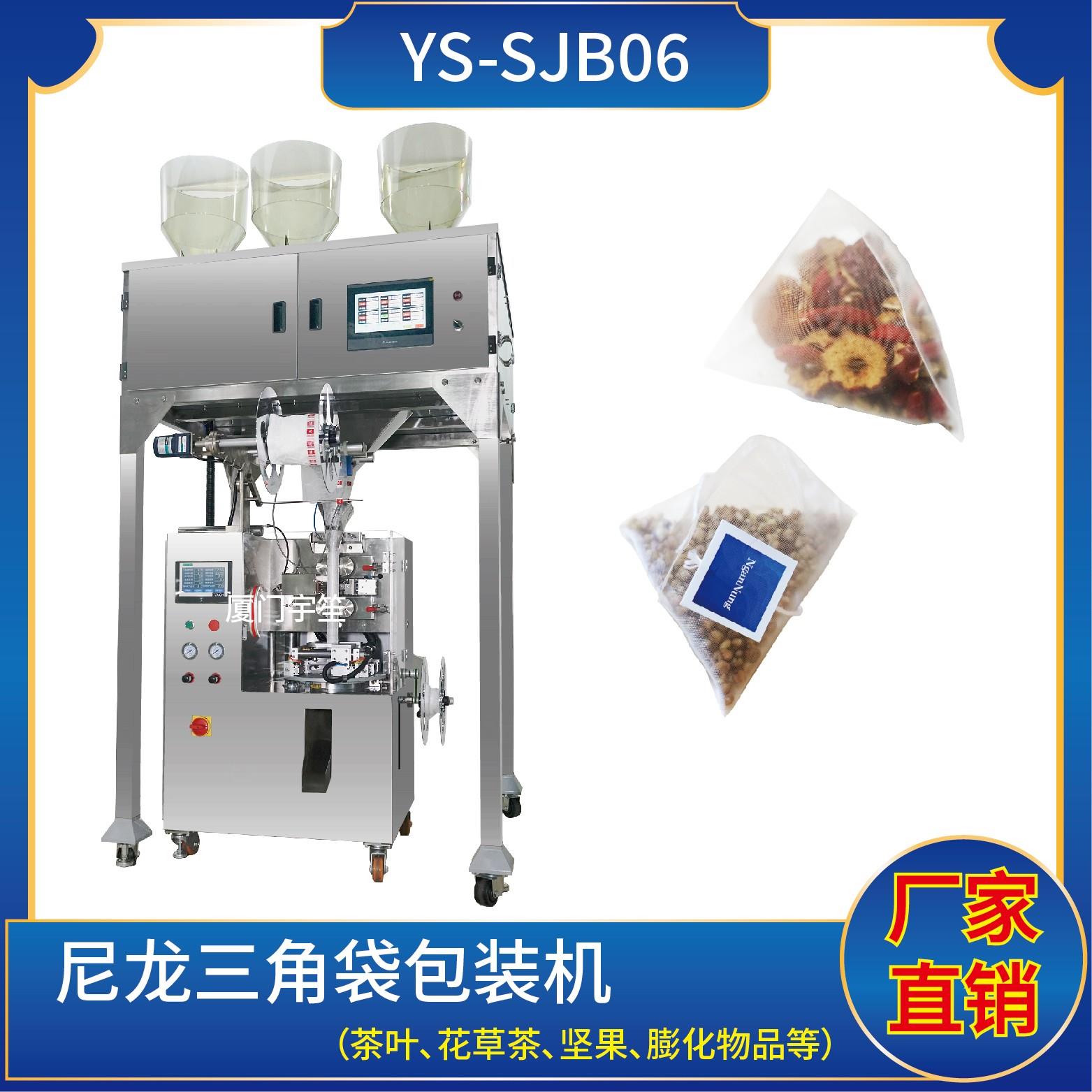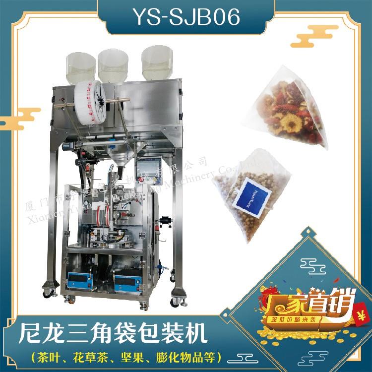 YS-SJB06尼龍三角袋包裝機(電子秤系列) 特點 1、適用于綠茶、紅茶、花茶、咖啡、中國茶、健康茶、中藥茶、顆粒等。2、可用于平面袋包裝、三角立體包裝等形式包裝袋。3、整機可自動完成上料、計量、制袋、封口、切斷、計數、成品輸送等功能。4、選用進口超聲波封口,電子稱計量下料方式,封口牢固,下料準確。5、包裝材料:…