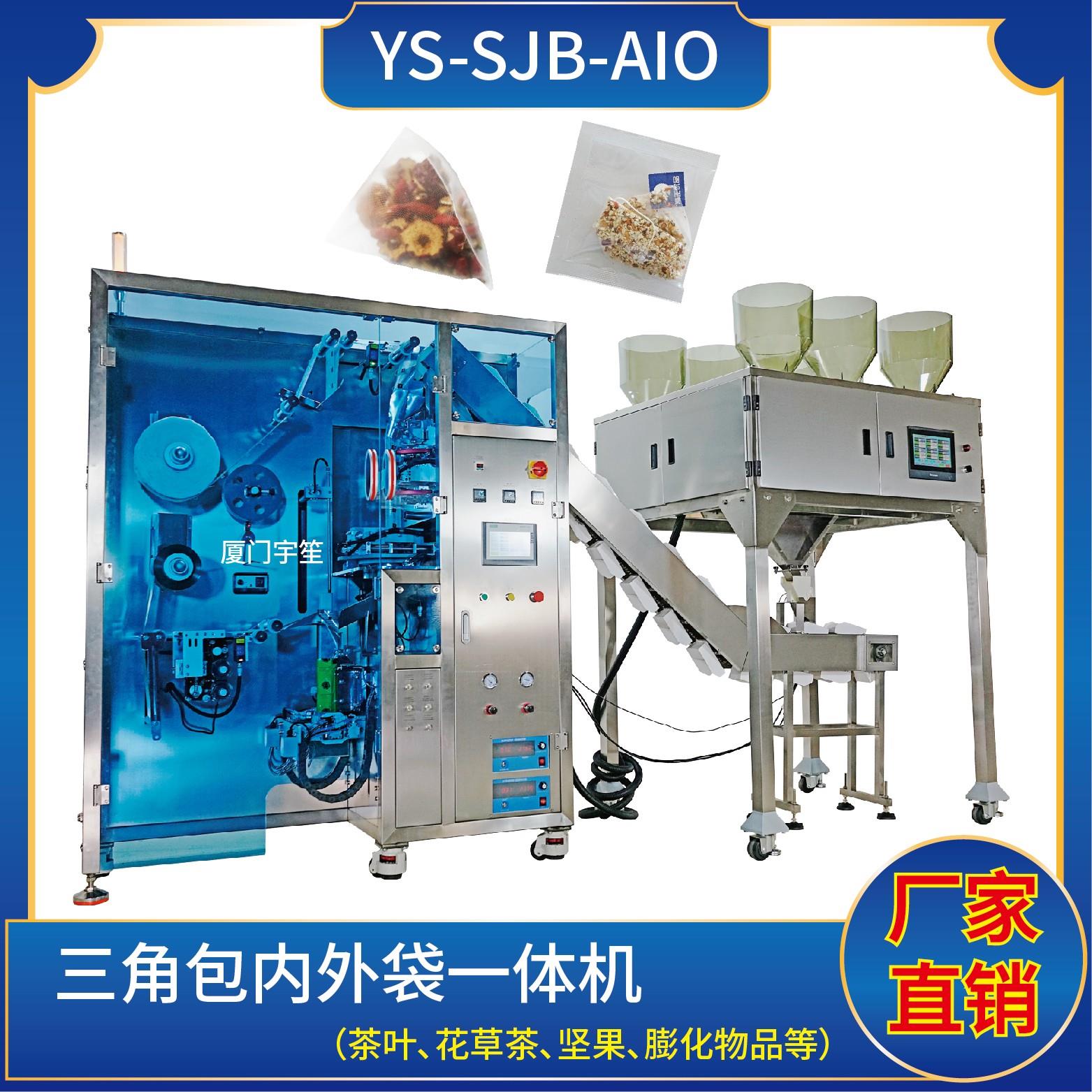 YS-SJB-AIO 三角包內外袋一體機特 點 1、適用于綠茶、紅茶、花茶、咖啡、中國茶、健康茶、中藥茶、顆粒等。2、可用于平面袋包裝、三角立體包裝等形式包裝袋。3、整機可自動完成上料、計量、制袋、封口、切斷、計數、成品輸送等功能。4、選用進口超聲波封口,電子稱計量下料方式,封口牢固,下料準確。5、包裝材料:尼龍、P…