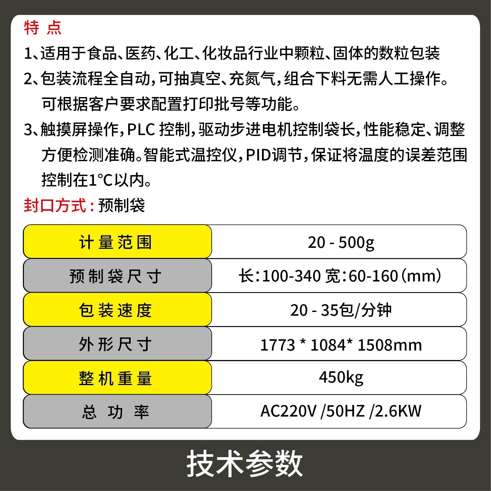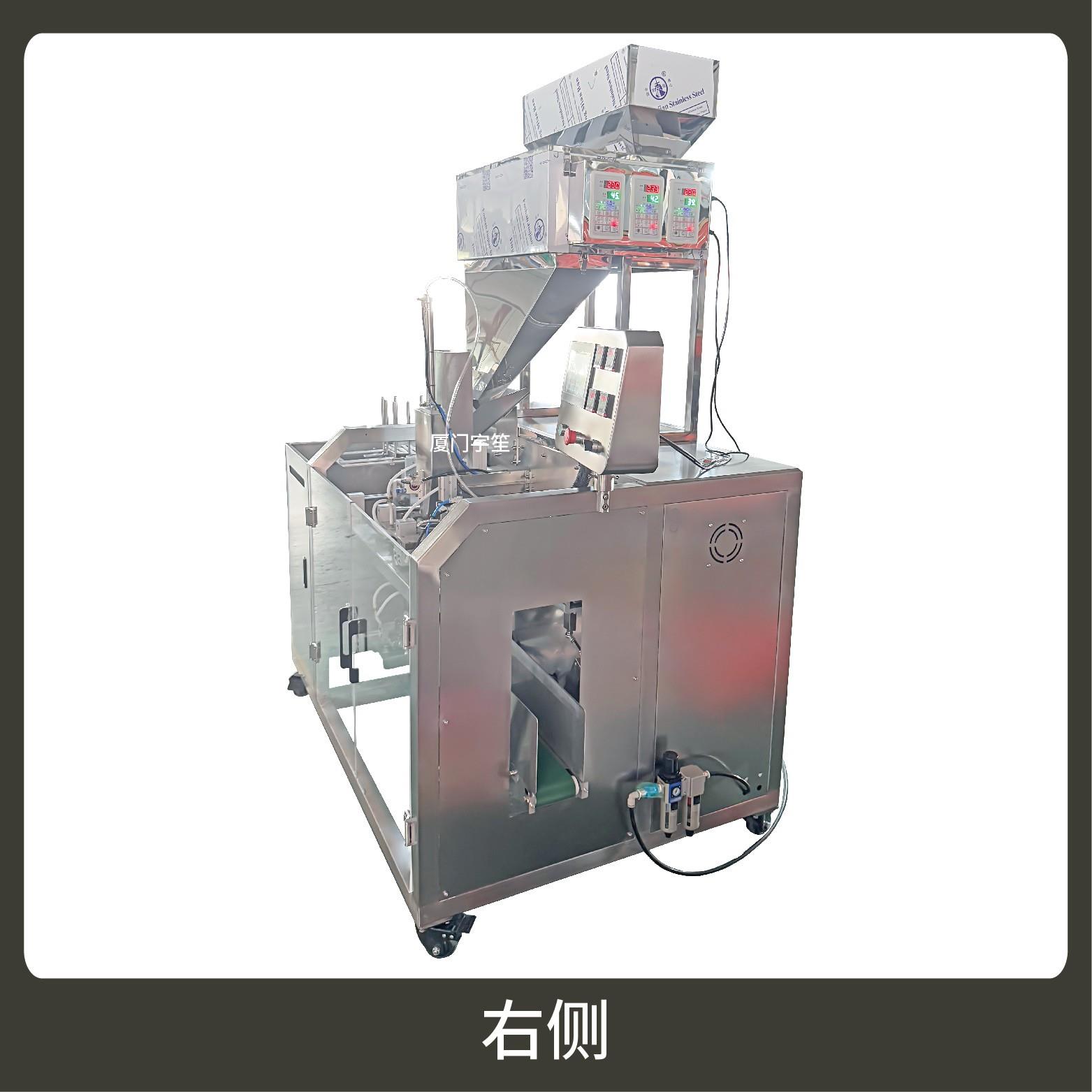 2、包裝流程全自動,無需人工操作,可抽真空、充氮氣,組合下料??筛鶕涮钗锪系男再|選配不同的下料結構,且可根據客戶要求配置打印批號等功能。