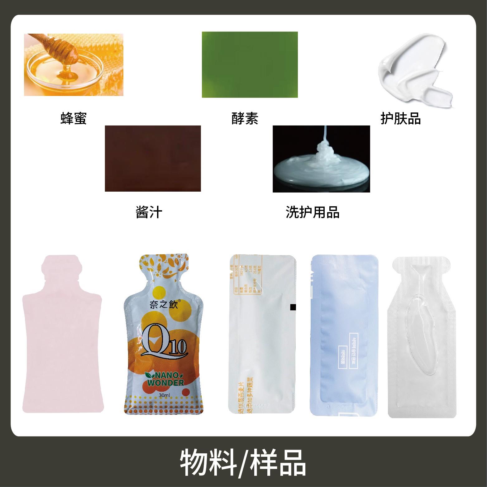 1、適用于各行業中酵素、果汁、漱口水、洗護用品、染發劑、化妝品小樣等醬料、液體物品的雙列異形袋計量包裝。Suitable for the double-row irregular bag metering and packaging of pastes and liquids like enzymes, fruit juices, mouthwash, toiletries, hair dyes, and cosmetic sample sachets in various industries.