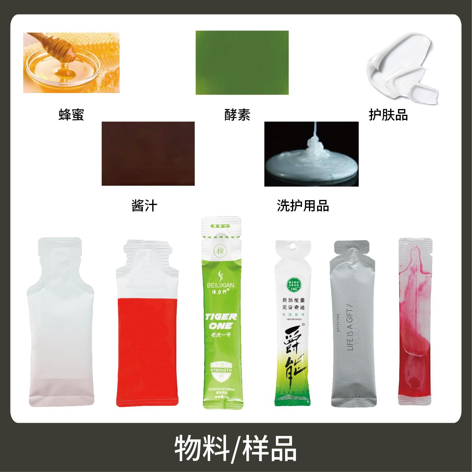 適用于各行業中酵素、果汁、漱口水、洗護用品、染發劑、化妝品小樣等醬料、液體物品的異形袋計量包裝。